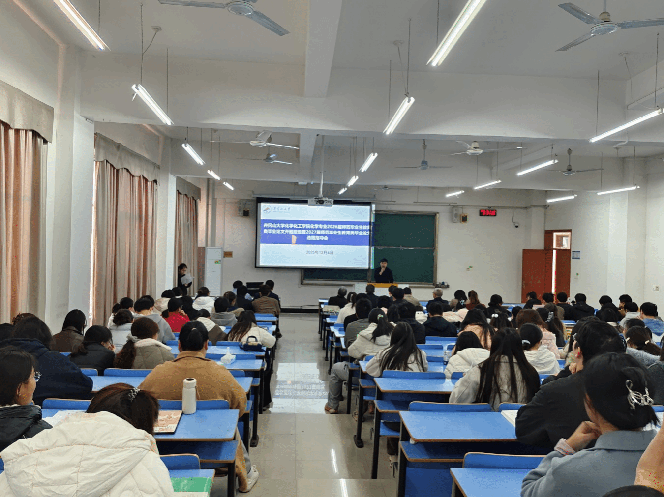 为扎实推进“三习贯通”人才培养模式,强化高校与基础教育协同育人机制,切实提升化学师范专业毕业生的教研实践能力与毕业论文质量,12月6日上午8:30,化学化工学院在第11栋教学楼B106教室隆重召开2026届师范毕业生教育类毕业论文开题报告会暨2027届师范毕业生教育类毕业论文选题指导会。会议特邀江西师范大学党委常委、副校长刘利民,基础教育一线专家吉安市教研室刘小云老师、吉安县第二中学欧阳群昌老师、吉安一中陈筱勇老师、吉安市第三中学徐婕老师莅临指导,学校教务处副处长刘诚,化学化工学院副院长张定娃、韩润林,化学系主任叶慧贤,全体教育类毕业论文指导老师及2022级、2023级化学师范生共计150余人参加,会议由化学系主任叶慧贤主持。