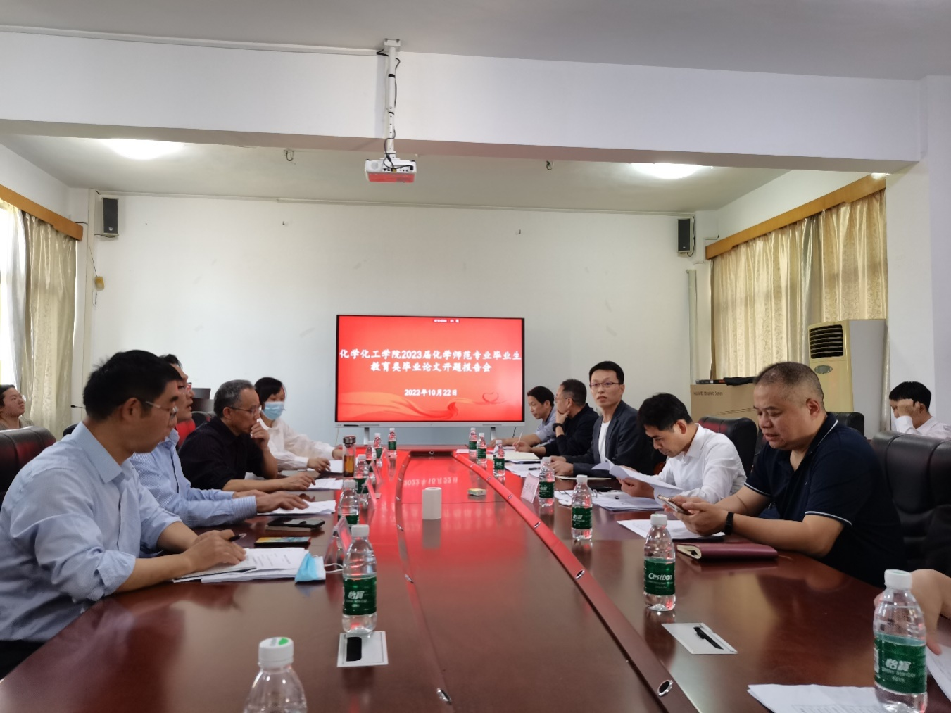 2022年10月22号下午,我院在学院6楼会议室举行了2023届化学(师范)专业毕业生教育类毕业论文开题报告会。本次会议由学院副院长刘诚主持,学校党委常委、副校长刘利民,学院院长陈文通、副院长张定娃及全体教育类毕业论文指导教师参加会议,会议还特邀吉安市教研室主任邹正大、吉安县第二中学副校长欧阳群昌、吉安市第八中学校长陈新、吉安县第三中学化学教师陈香华等四位一线教育教学专家亲临指导。