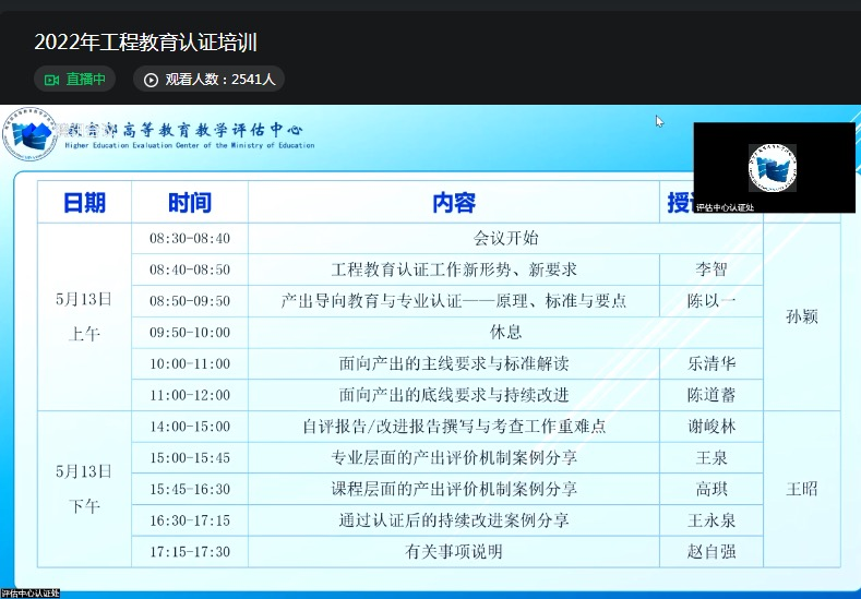 为做好2022年工程教育专业认证工作,进一步提高工程教育专业认证申请质量以及全体教师对工程教育认证的认识,2022年5月13日,我院组织教师在学院六楼会议室参加教育部高等教学评估中心举办的2022年工程教育认证专题培训,本次培训会以“腾讯会议”线上直播的形式进行,共有九个专题报告。院长隋岩、副院长陈文通、张定娃、刘诚出席会议,材料化学和化学工程与工艺两个工科专业的专业负责人、专业骨干及专任教师20余人参加会议,不能到校的老师进行线上自主学习。培训会由副院长刘诚主持。