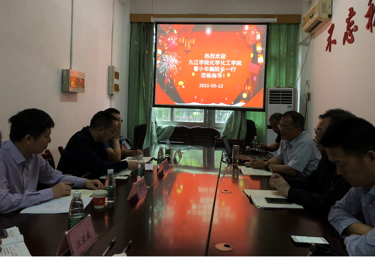 2021年5月12日上午,九江学院化学化工学院副院长曹小华、材化教研室主任占昌朝、化学及化工教研室副主任汪亚威和向程一行四人就国家一流专业申报与建设、教学管理和学生创新创业等工作前来考察交流。学院院长隋岩、副院长张定娃、应化所副所长陈文通、各专业负责人、实验室主任等参加交流会。