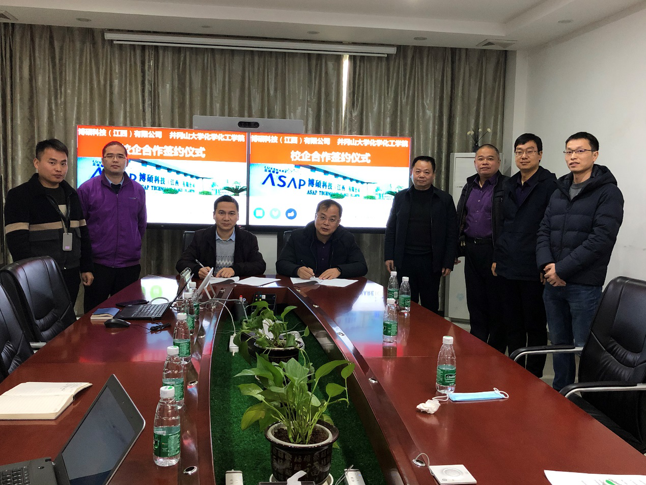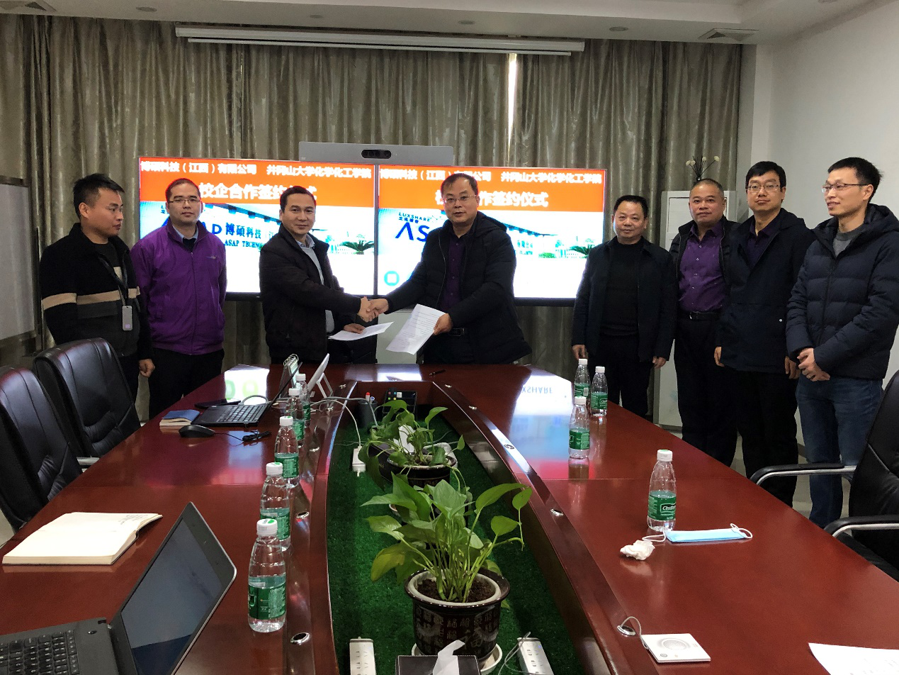 2021年1月21日,井冈山大学化学化工学院与博硕科技(江西)有限公司签署战略合作协议,并为“井冈山大学化学化工学院产学研合作及实习实践基地”揭牌。我院党委书记康云峰、院长隋岩、应化研究所副所长陈文通等一行博士专家团队,和博硕科技有限公司彭建文总经理、部分研发人员等出席仪式。根据协议约定,双方将在博士后人才联合培养、新产品合作研发、实验平台共建、学生实习与就业等方面开展深度合作。近年来,为适应省新材料战略产业发展的需求,化学化工学院不断深化、创新校企合作机制模式,发挥学院人才优势,服务地方经济发展,目前已有多位博士到当地企业长期兼职。