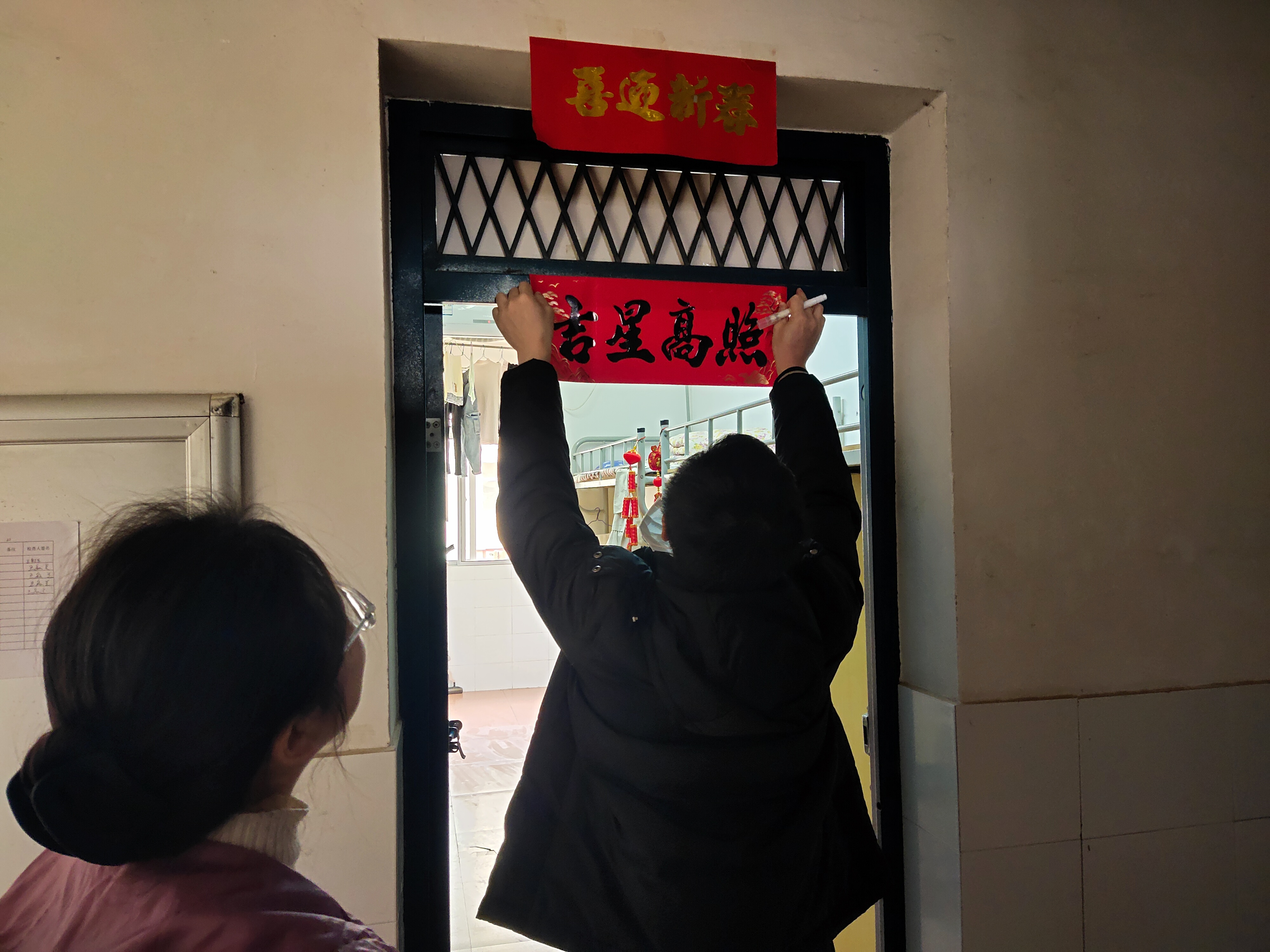 院学管教师一行来到寒假集中住宿的学生宿舍35栋226室看望慰问留校的17应化班河北籍学生蒋婷婷同学,赠送上一份特别的春节大礼包,并送上新春祝福。老师们仔细询问其学习、生活和家里情况,细心了解有什么困难,希望她科学安排寒假留校期间的日常学习和生活,勉励同学按照学校统一部署,继续做好日常防护,加强身体锻炼,合理作息,健康饮食;叮嘱她多与家人沟通,让家长放心、安心,经常与辅导员、班主任联系,有困难第一时间跟老师、学院、学校沟通,学校将全力以赴为他们排忧解难。慰问期间,老师们还同学们一起挂福字、贴春联布置寝室。