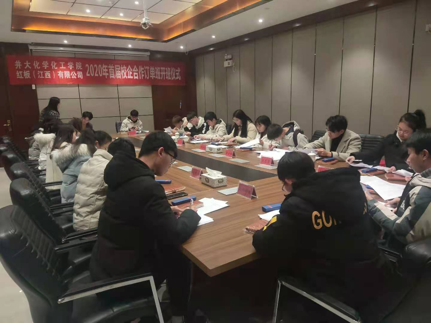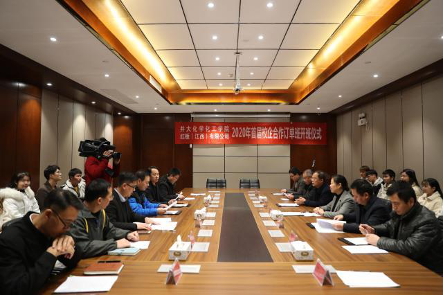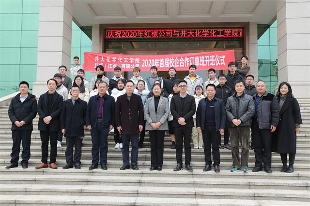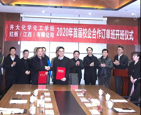 如何在高校与企业之间搭建精准的人才供需平台,打造校企“双主体育人”的合作办学品牌?近年来,我院探索建立了“高校—企业”双方联动的人才培养机制,由企业将人才需求摆出来,校企双方根据企业需求共同对学生进行“订单式”培养。12月19日,红板(江西)有限公司与化学化工学院的“红板订单班”签约暨开班仪式在红板(江西)有限公司举行。井冈山大学党委书记胡春晓出席并讲话,井冈山经开区党工委书记彭学凯,党工委委员、组织部长、人社局长龙井松,红板(江西)有限公司总经理文伟峰,学院党委书记康云峰、院长隋岩,党委副书记刘志勇,应化研究所副所长陈文通出席仪式,红板(江西)有限公司行政副总、工会主席刘绚主持仪式,18级“红板订单班”21名学员参加了仪式。