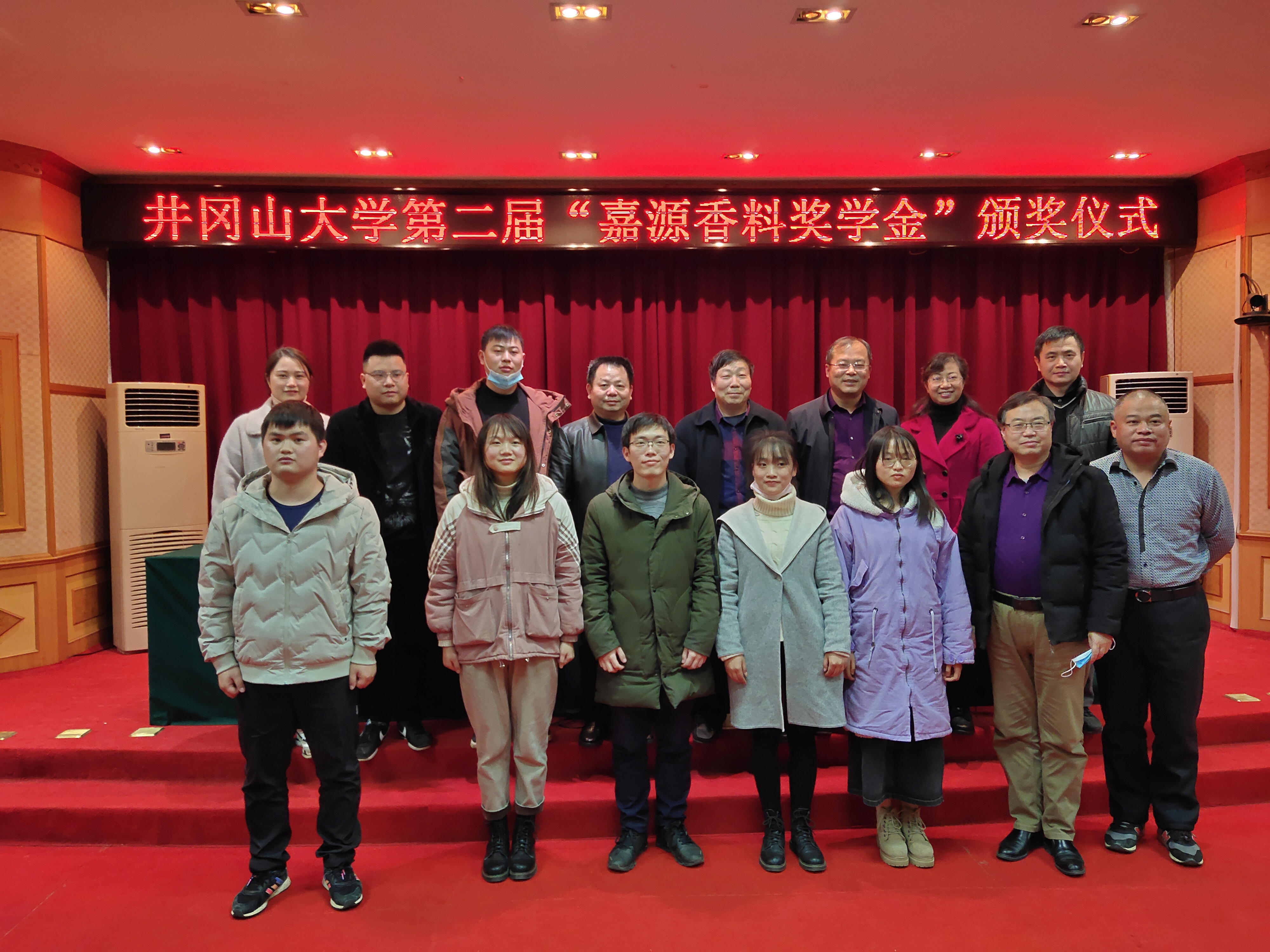 1月15日,学校举行第二届“嘉源香料奖学金”颁奖仪式,江西嘉源香料有限公司副总经理余学松和校党委常委、副校长吕玉华出席仪式并讲话,吕玉华向余学松先生赠送捐资荣誉锦牌。5名大学生获得5000元奖学金,获奖学生代表发了言。
