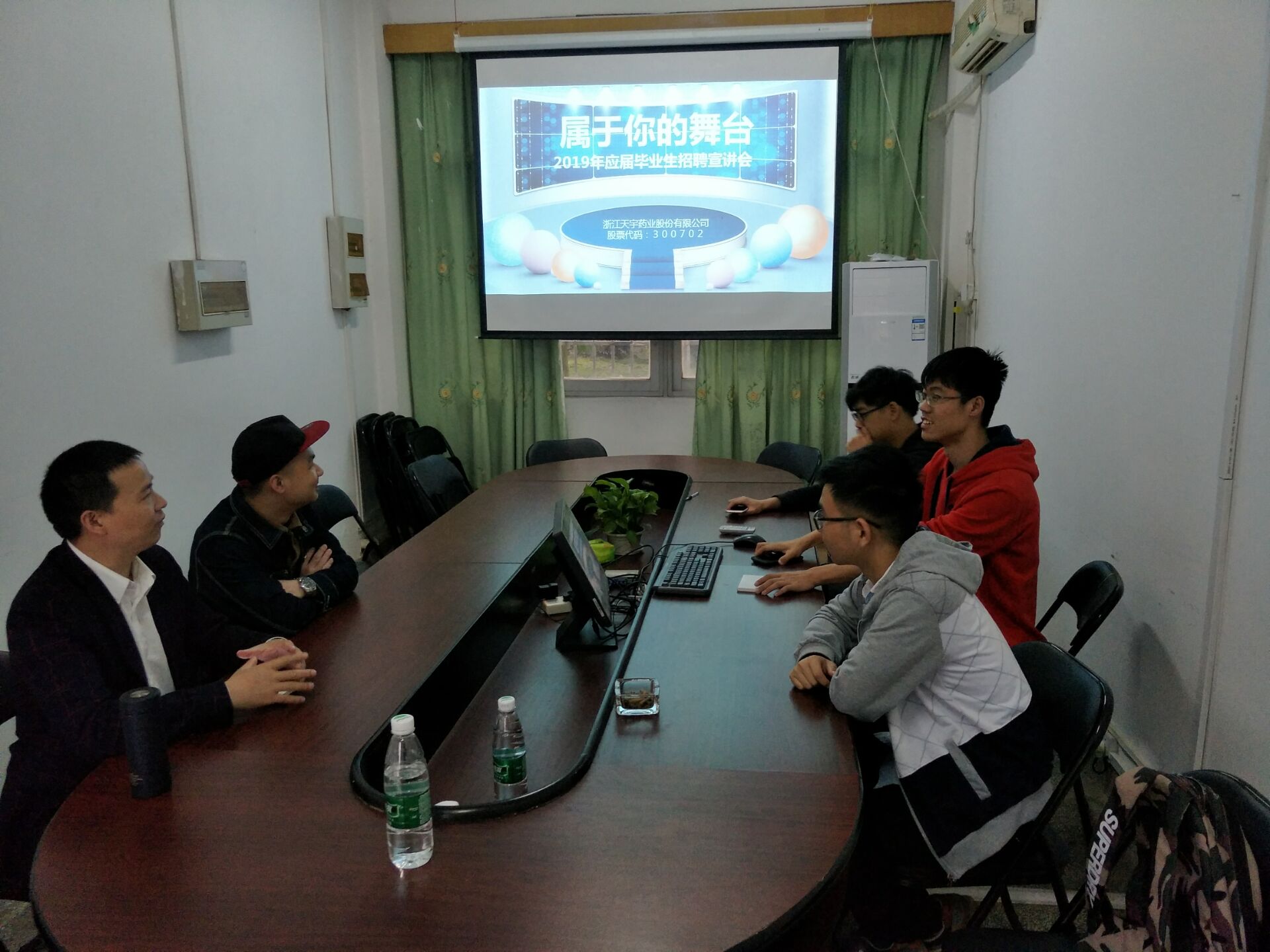 2019年5月7日浙江天宇药业股份有限公司刘经理在学院会议室举办专场招聘会。浙江天宇药业股份有限公司(股票代码300702)成立于2003年,总部位于浙江省台州市,是一家专业研究、开发、制造原料药以及高级医药中间体的股份制制药企业。公司注册资金1.8亿元,现拥有六家全资子公司,员工总数3000余人,共占地700余亩,是国家火炬计划重点高新技术企业。公司建设有省级企业技术中心和上海研发中心,设立博士后工作站,截至目前,公司已拥有12项国家、国际发明专利;有2个创新药物原料药正在报批和报产中,先后被认定为浙江省科技创新载体、创新试点企业和专利示范企业。