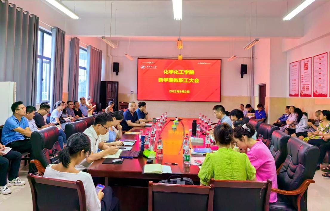 2023年9月2日下午3点化学化工学院召开全院教职工大会,集中政治学习,传达会议精神,总结学院上半年工作并布置新学期重点工作。学院党委书记康云峰、院长陈文通、党委副书记张华、副院长张定娃、刘诚,应化研究所副所长易绣光出席会议,会议由陈文通主持。