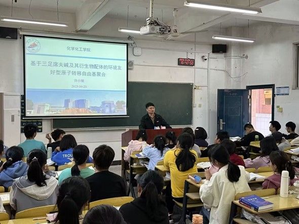 2023年10月23日,化学化工学院博士许小陵在5栋410作了题为“基于三足席夫碱及其衍生物配体的环境友好型原子转移自由基聚合”的学术报告。我院博士教师及2023级化学专业学生共计七十余人参加了报告会。