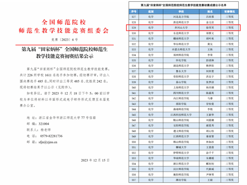 12月15日,由浙江师范大学主办、田家炳基金会赞助、全国地方高等师范院校教务处长联席会议指导的第九届“田家炳杯”全国师范院校师范生教学技能竞赛初赛结果公布,化学化工学院化学师范专业学生徐笑笑荣获高中化学组全国三等奖。