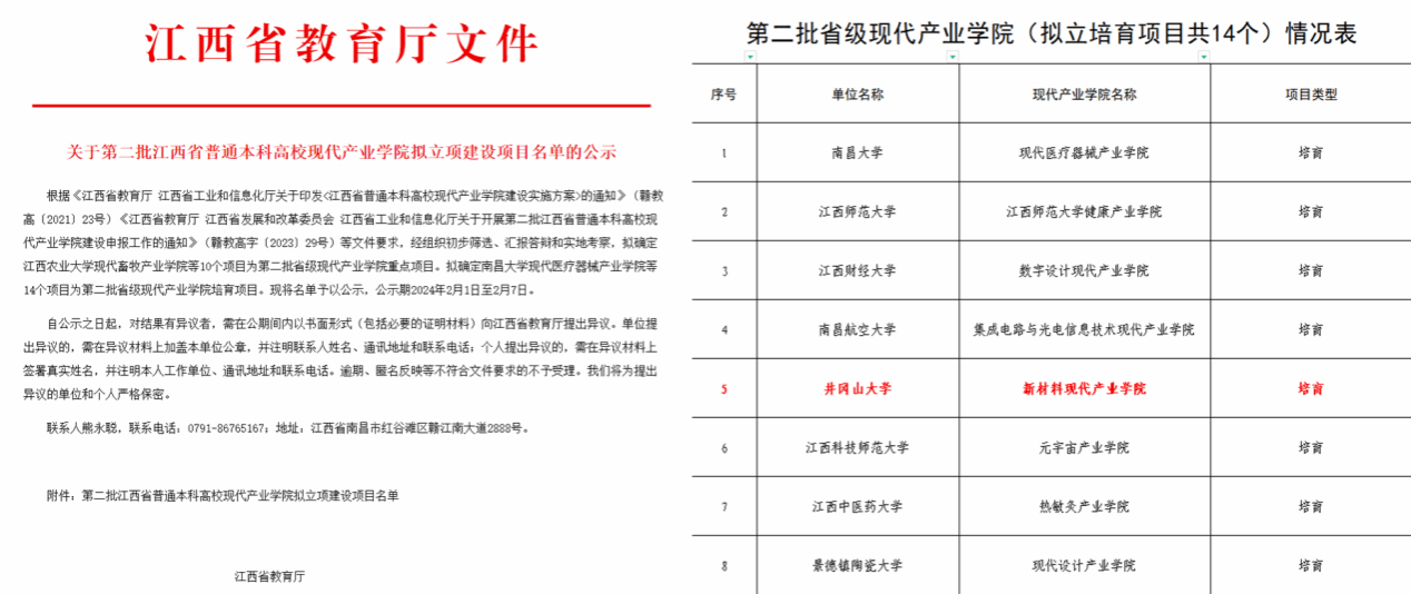 近日,江西省教育厅发布了《关于第二批江西省普通本科高校现代产业学院拟立项建设项目名单的公示》,我校“新材料现代产业学院”被确定为省级现代产业学院立项建设项目。此次入选标志着我校在产教融合、校企协同育人的发展战略中取得了新的突破。