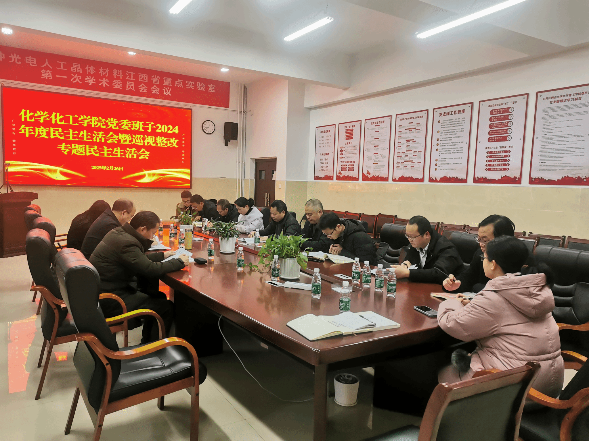 2月26日上午,化学化工学院党委班子召开2024年度民主生活会暨巡视整改专题民主生活会。校督导组组长、校党委常委、副校长黄族豪一行3人到会指导。学院党委书记康云峰主持会议,党委班子全体成员参加,非党员处级干部、各党支部书记和教职工代表列席会议。
