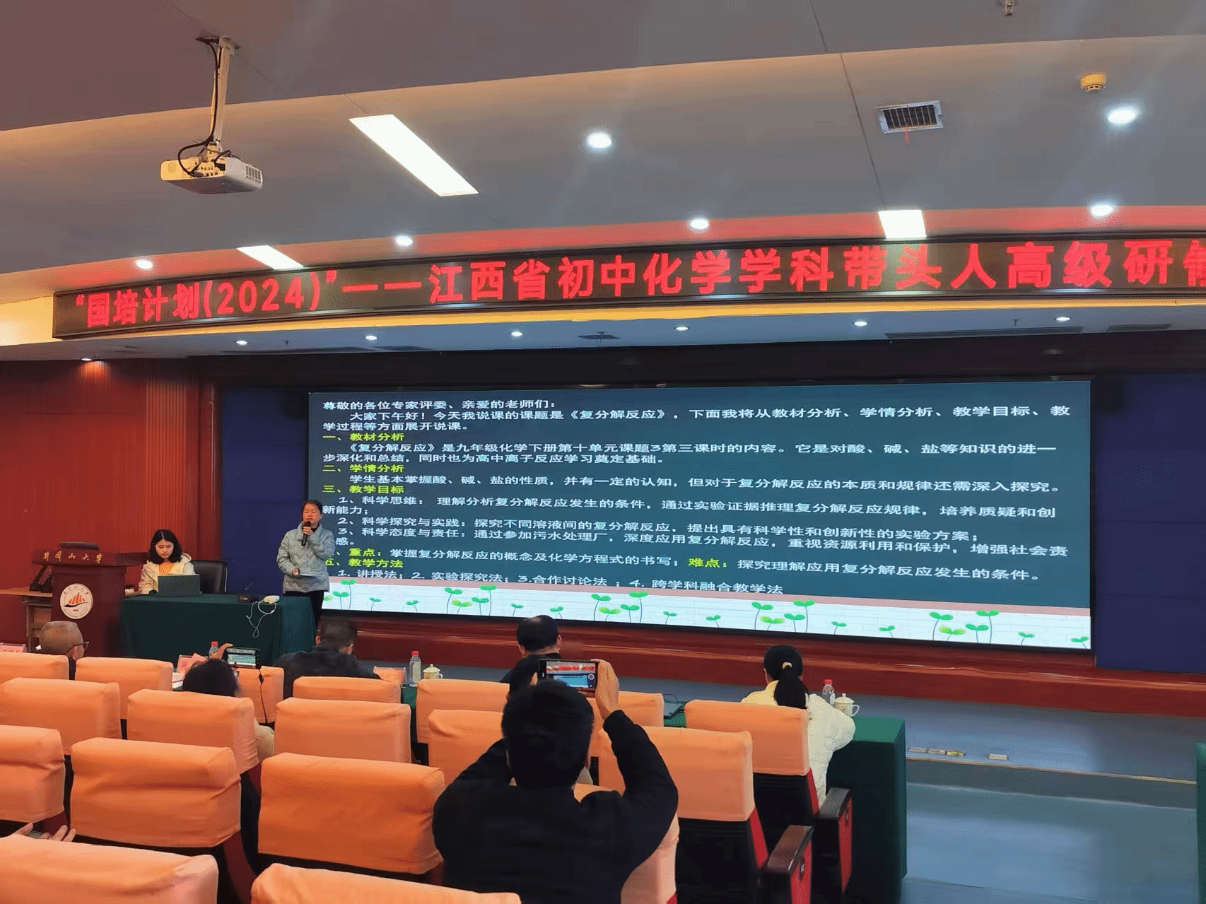 为深化师范生教学实践能力培养,搭建教育教学经验交流平台,3月13日下午两点,化学化工学院组织2023级师范生赴井冈山大学新学术交流中心学术报告厅观摩“国培计划(2024)”江西省初中化学学科带头人高级研修班学员说课比赛。